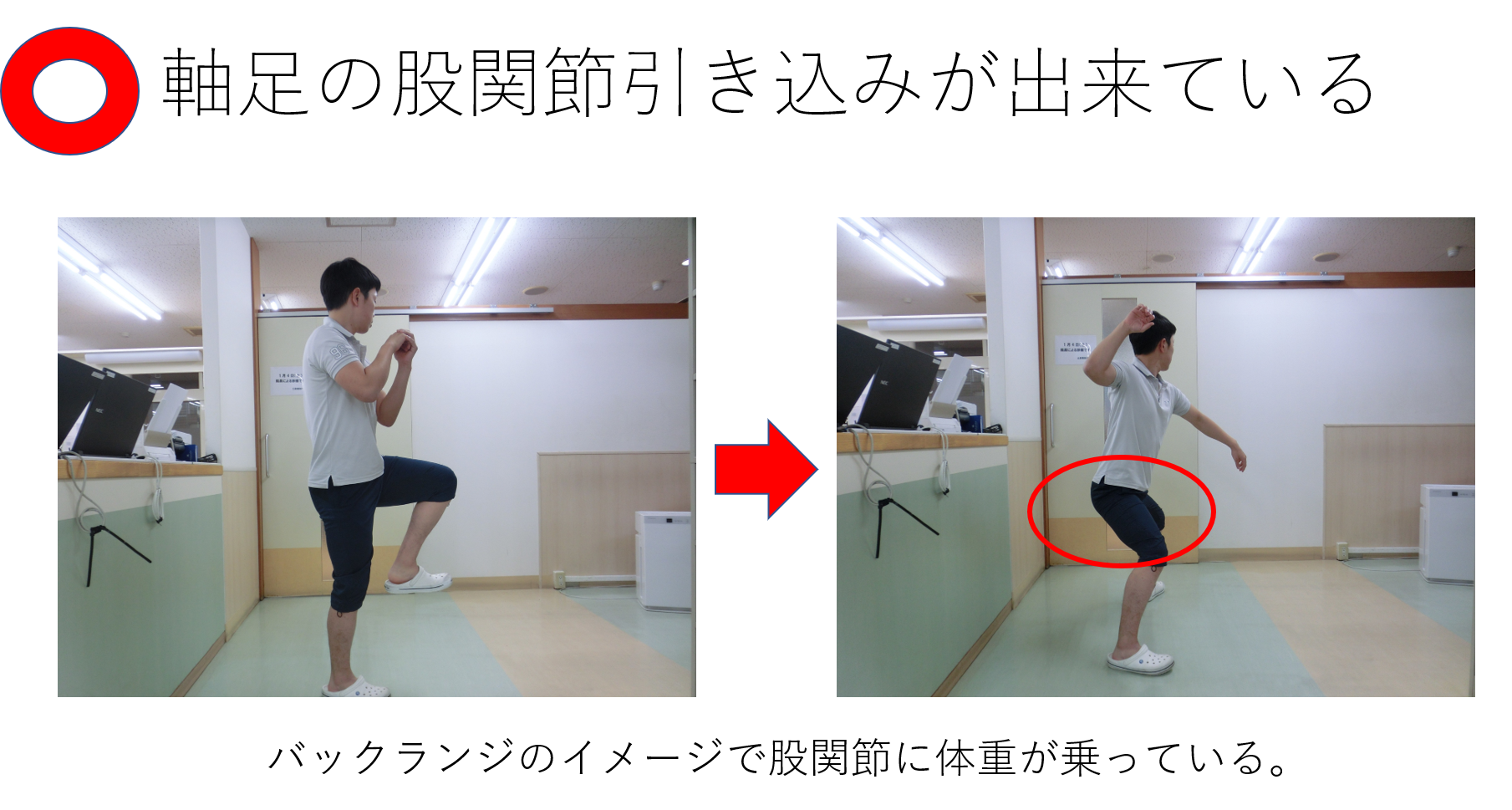 体重移動の際に股関節から力が抜け、体重が膝に乗る形となります。