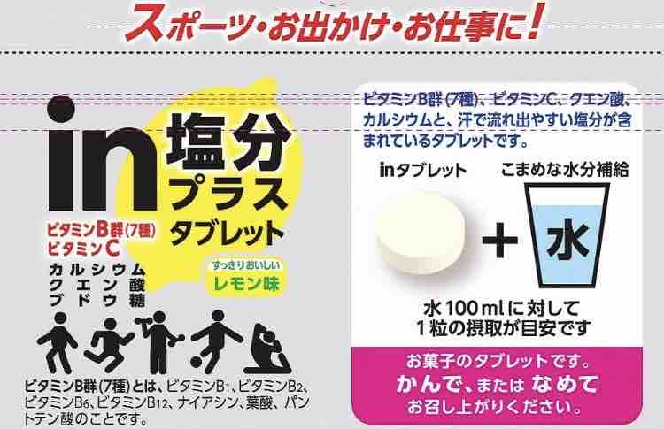 ※森永製菓 inタブレット塩分+ 参照これだけで塩分摂取しようと思ったら1日2リットルの水分補給をする場合は、20個食べないといけません。