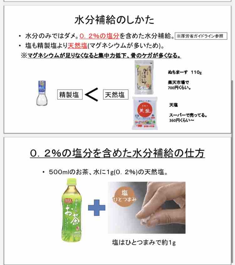 厚生労働省のガイドラインでは、熱中症予防に0.1〜0.2%の塩分を入れた水分補給を推奨しています。
