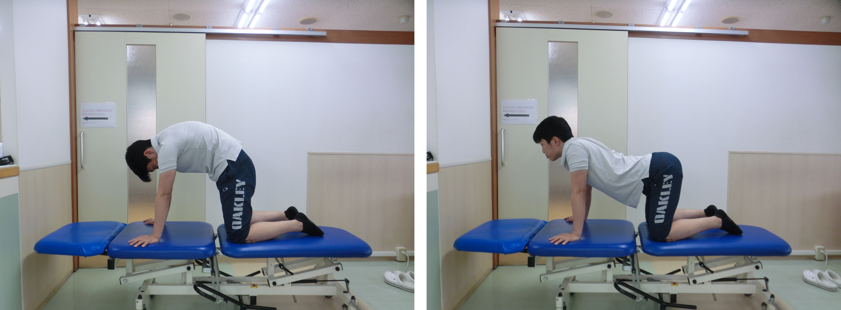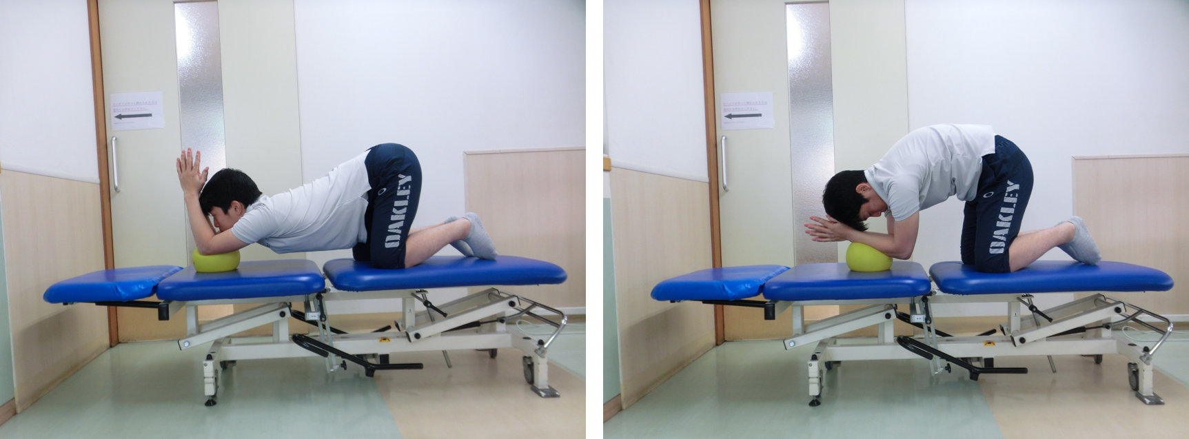 左の写真で最大限体を丸く(肩甲骨を押し出すイメージ)